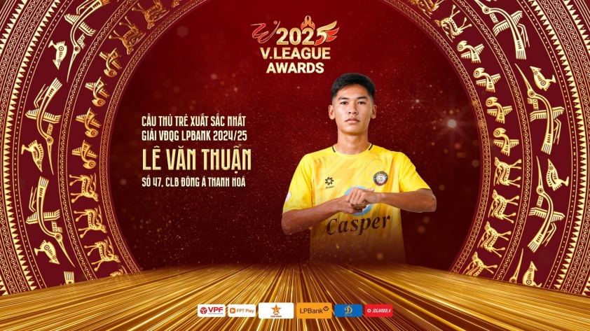 Ở hạng mục Cầu thủ trẻ xuất sắc nhất V-League 2024/25, tiền vệ Lê Văn Thuận của CLB Thanh Hoá đã vượt qua nhiều ứng cử viên tiềm năng để có lần đầu tiên nhận danh hiệu cao quý ở tuổi 19.